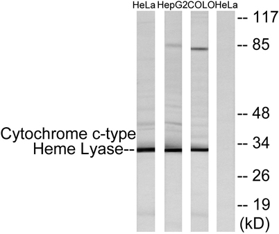 | Immunogen: | The antiserum was produced against synthesized peptide derived from human Cytochrome c-type Heme Lyase. AA range:81-130 |