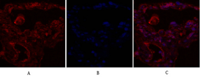Immunofluorescence analysis of human-lung tissue. 1,IRS-1 Polyclonal Antibody(red) was diluted at 1:200(4°C,overnight). 2, Cy3 labled Secondary antibody was diluted at 1:300(room temperature, 50min).3, Picture B: DAPI(blue) 10min. Picture A:Target. Pictur